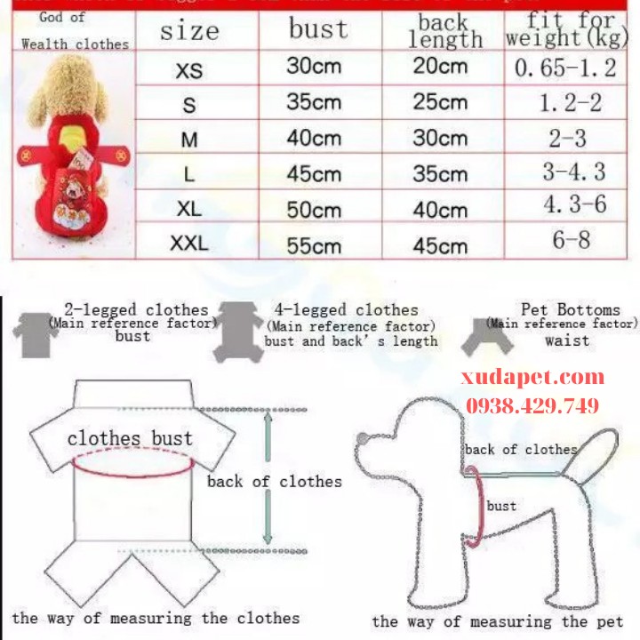 Bảng kích thước các size của Áo Thần Tài cho chó mèo Xudapet